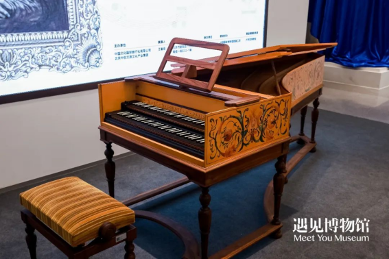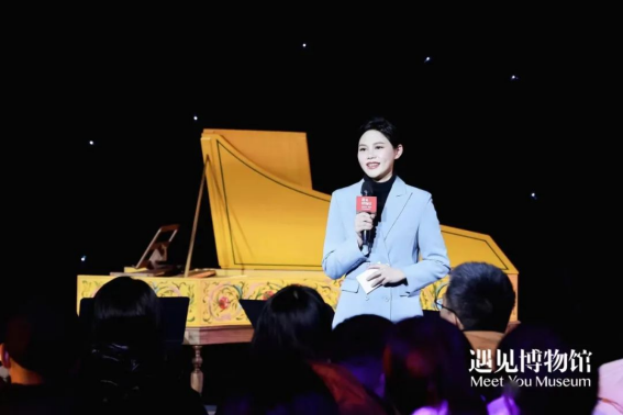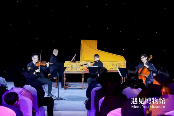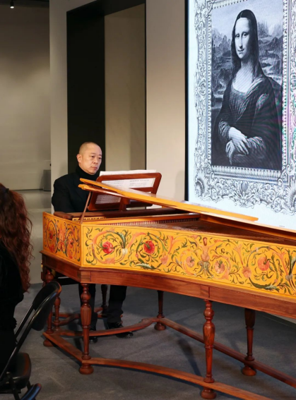 音乐会现场的最大看点当属羽管键琴的现场演奏,这架古钢琴由法国制造、人工手绘完成,琴上的花朵样式是根据法国凡尔赛宫的花卉制式手绘而成 ,它不仅是一件乐器,更是一件精美绝伦的艺术品。它的演绎体现了音乐的守护与传承,更能令听者体味钢琴初音的美好。优美的音符从国交羽管键琴演奏家冯丹老师的指尖流出,行云流水,古朴迷人,与博物馆内展出的108件卢浮宫国宝级铜版高定版画,共同为观众再现300年匠心传承的卢浮宫艺术珍品。
