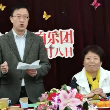 刘庆玲和田振林两位老师走到大家中间为大家演唱歌曲《婚誓》《敖包相会》