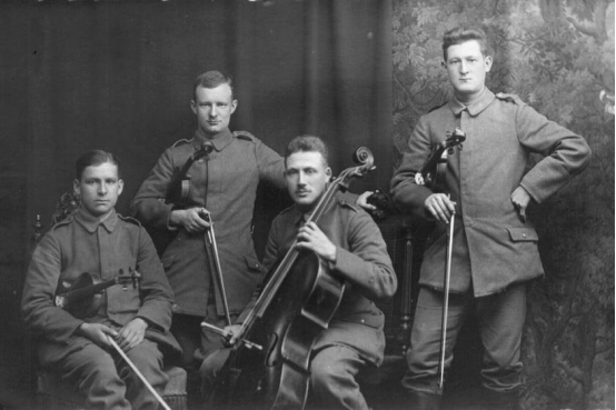 青年时代的欣德米特热衷于四重奏演出,图为第一次世界大战期间,欣德米特(左二)在军乐团中成立的弦乐四重奏(摄于1918年)