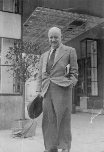 二战结束后,欣德米特回到欧洲,图为1948年,欣德米特在德国法兰克福广播电台前的留影。